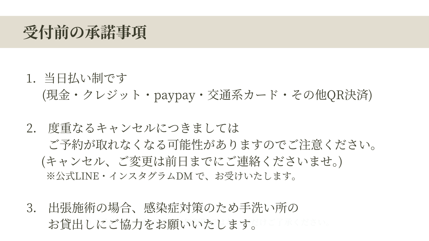・キャンセルや変更は、前日までにご連絡ください。無断キャンセルが続いた場合は、以後のご予約をお断りする場合があります。